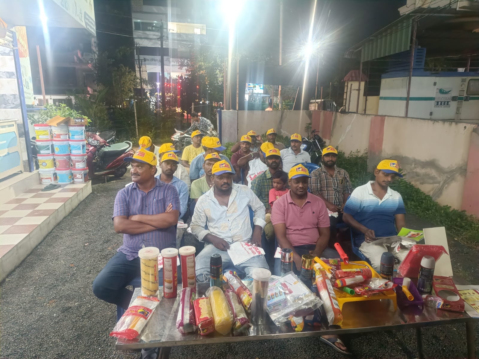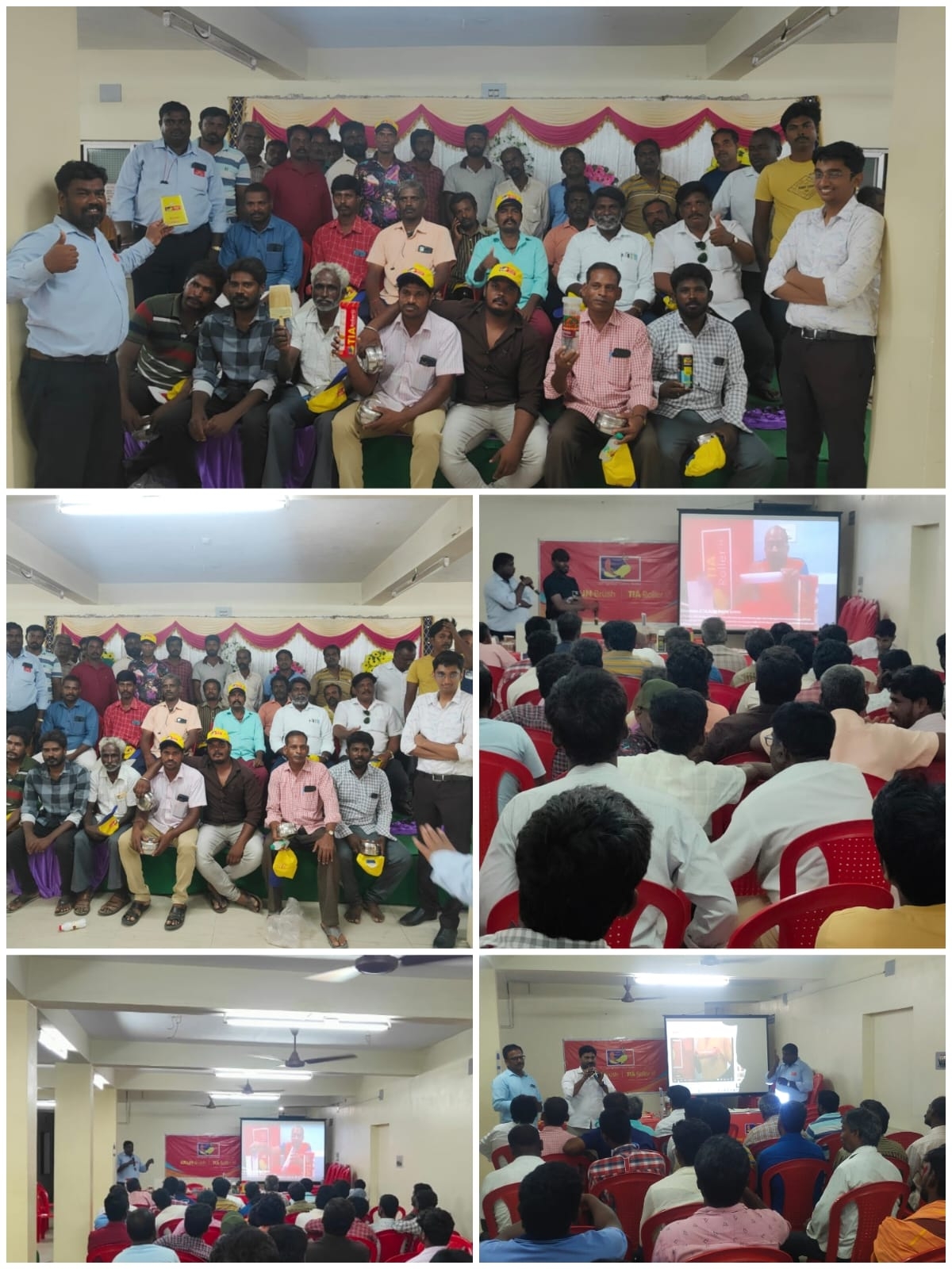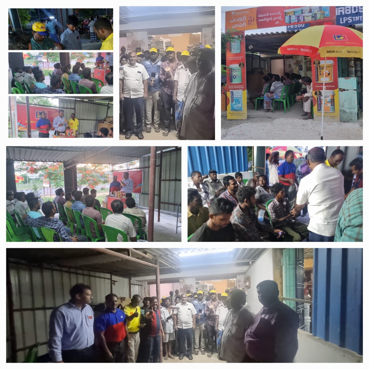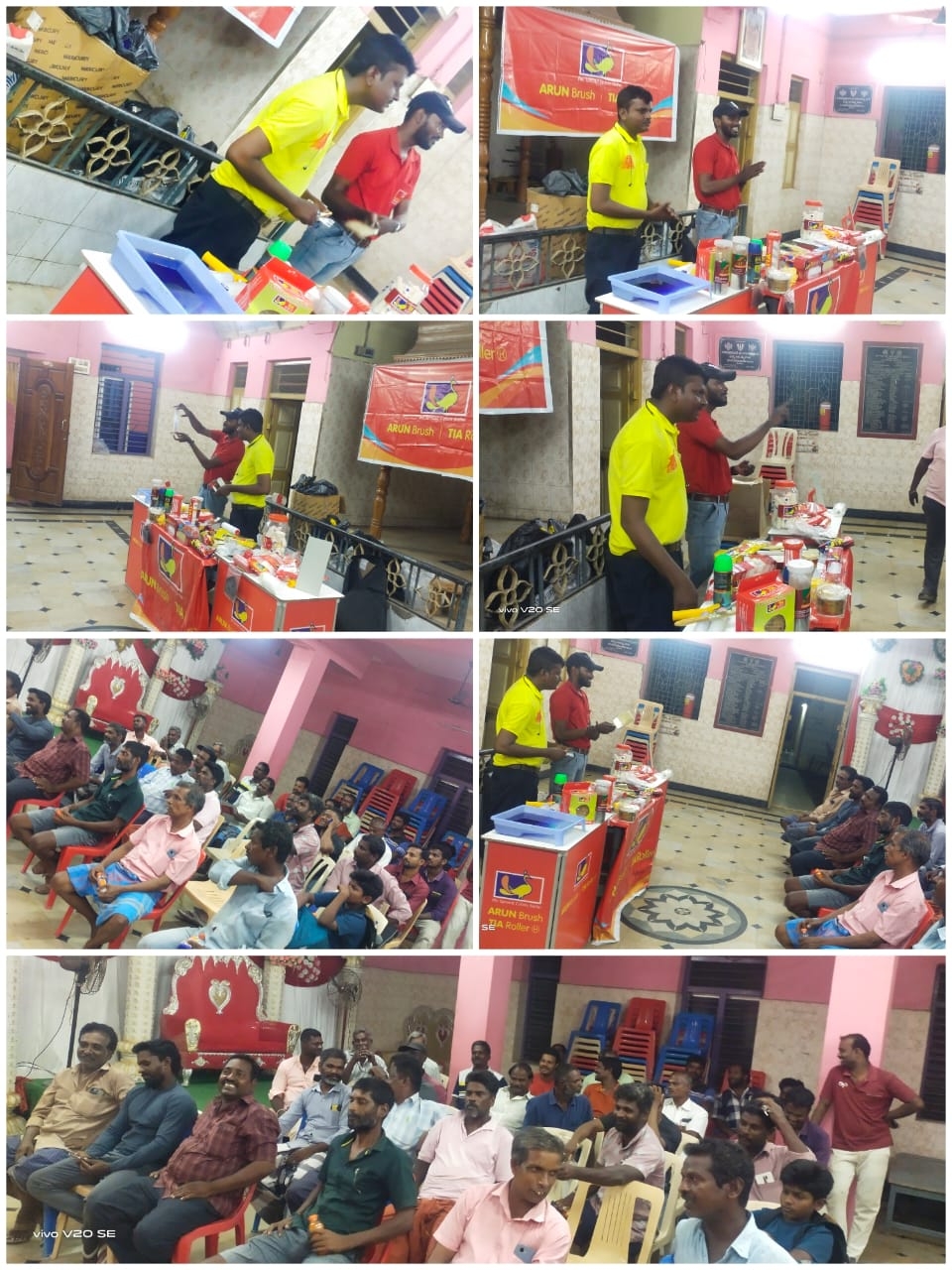 Read MoreIt sounds like there's a painters' meeting in Rajahmundry that includes demonstrations by TIA Roller and Arun Brush. This event seems to focus on showcasing painting techniques and tools. Painters are Provided with food and Complemented with Banians and Caps. (Meeting Date : 7.8.2024)